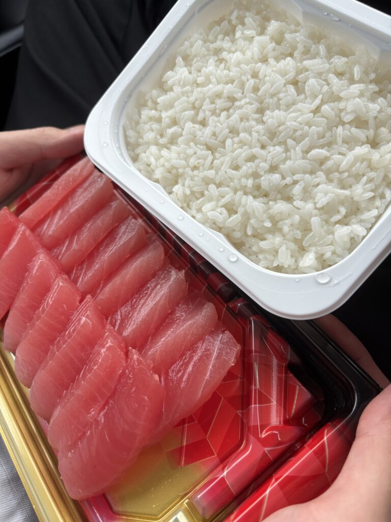 ↑パックのご飯とマグロの刺身を買って簡易海鮮丼にしてみました(笑)。